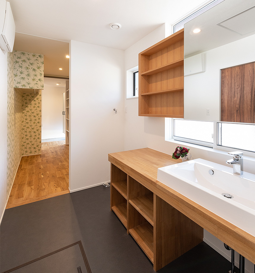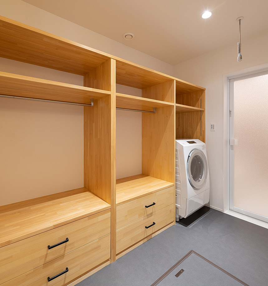 壁一面に造作棚を設け、衣類の収納や家族のタオル類もまとめて管理できます。