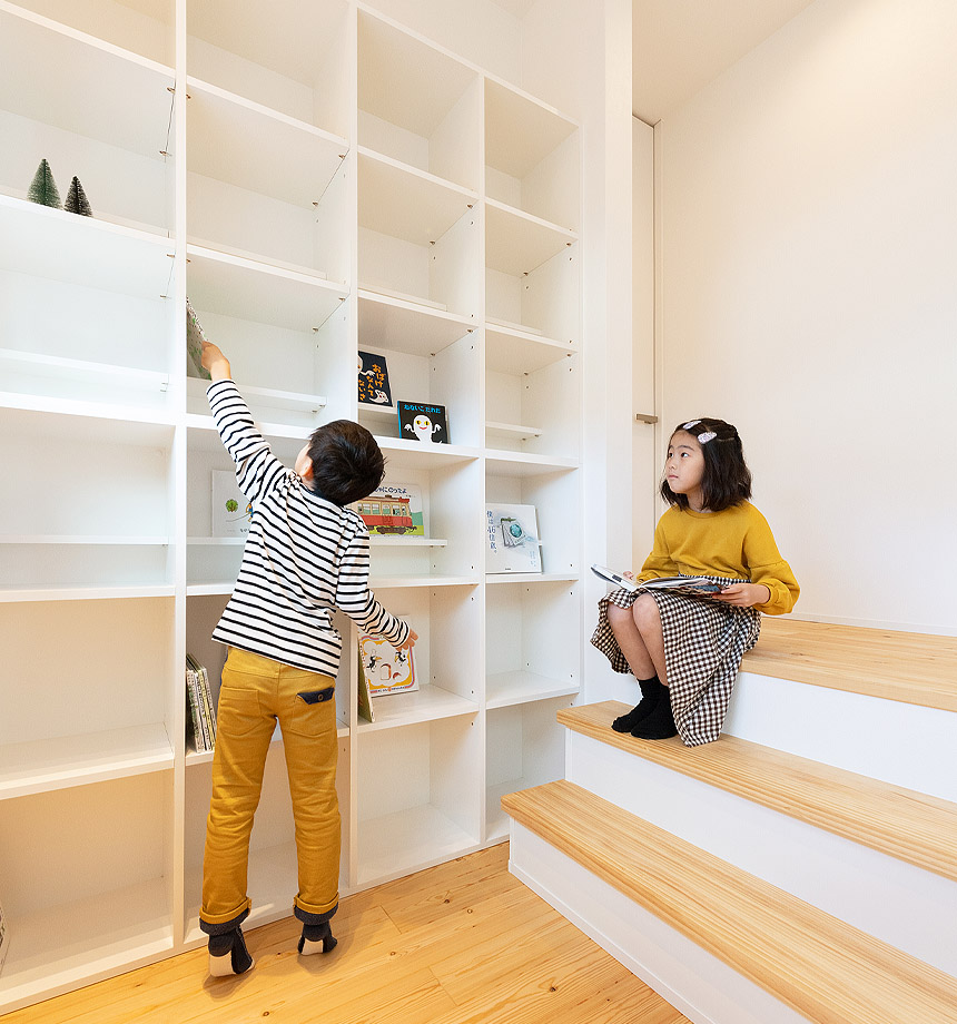 2階へ上がる途中に設けたスキップフロアは、家族のライブラリースペース。