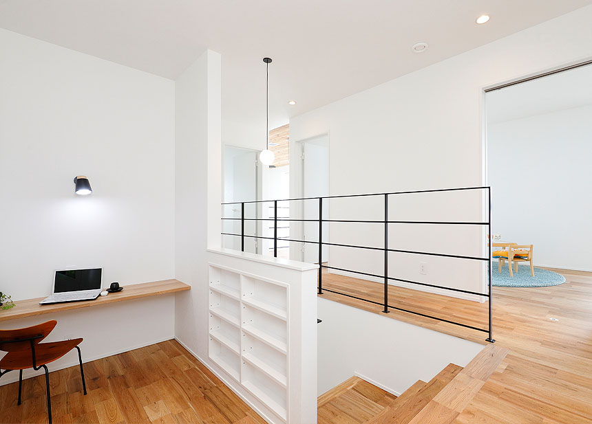 共働きのお施主さまが希望された、ワークスペースとしてのスキップフロア。2階とつながる位置に設けられたコンパクトな書斎は、集中しやすい半独立空間でありながら、家族の気配も感じられる程よい距離感が魅力です。