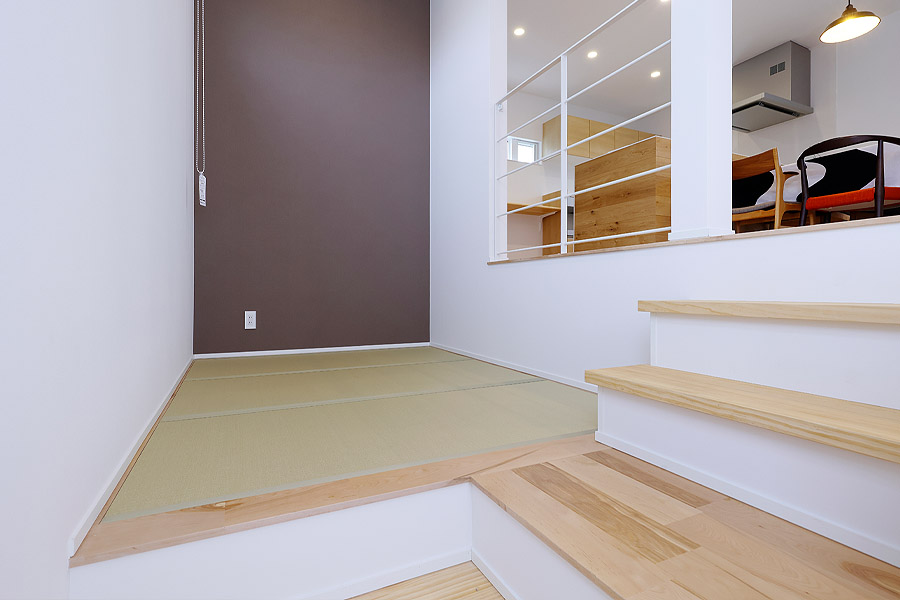 2階にあるリビングから1段下げた位置に設けた、約2.5帖の畳スペース。お施主さまが強く希望されたこだわりの一つです。