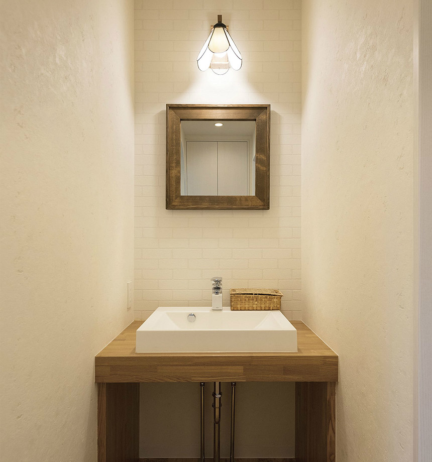 造作洗面台は、カウンター·ボウル·鏡を自由に組み合わせられるのが魅力です。木の質感を活かしたり、お気に入りのタイルやペンダントライトを合わせたりと、個性を出せるポイントが満載。