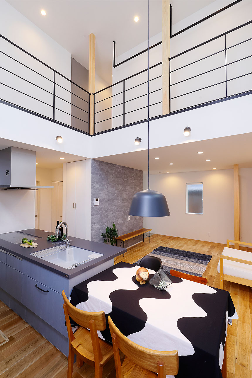 完成したお家は、あこがれの大開口の吹き抜けにより、のびやかで開放感あふれる空間に。リビングには床から天井までの連窓を設け、明るい光に包まれる心地よい場所となりました。