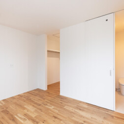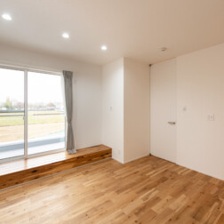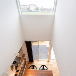 リビングには天井まである大きな窓。大きな窓からは、立地条件からの特権で自然をいっぱい感じる景色を望めます。オークの床材、キッチンもオーク色、またバーチカルブラインドもブラウン系を選びシンプルにまとめたインテリアの中で、アクセントとなるのがマリメッコのカーテン。お施主様らしさがでて、素敵です。
